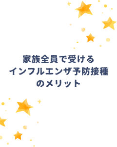 人混みでのマスク着用とワクチン接種: 流行期の人混みでは、必ずマスクを着用し、飛沫感染を防ぎましょう。また、予防接種は発症を完全に防ぐものではありませんが、インフルエンザにかかった場合の重症化や合併症を防ぐ効果が期待できます。まだ接種がお済みでない方は、ご検討ください。