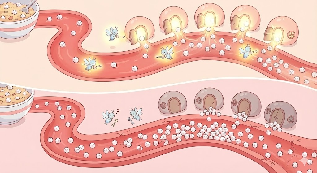 本来、食事でとった糖は「インスリン」というホルモンの働きによって、体のエネルギーとして使われます。しかし糖尿病の状態では、このインスリンが足りなかったり、うまく働かなくなることで、糖が血液中にたまりやすくなります。これが血糖値が高い状態です。